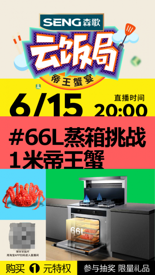 另一场6月15日天猫直播间,【森歌云饭局】继续开席,天猫款T5Z蒸箱款集成灶,挑战66L蒸箱蒸整只1米长帝王蟹,让深夜的电商直播不再为美食寂寞,《帝王蟹宴》直播间观看人次88万+,获赞45万+。直至目前,森歌内容直播依旧在不断创新,俘获了越来越多的网友的心智,创造着一个又一个奇迹。